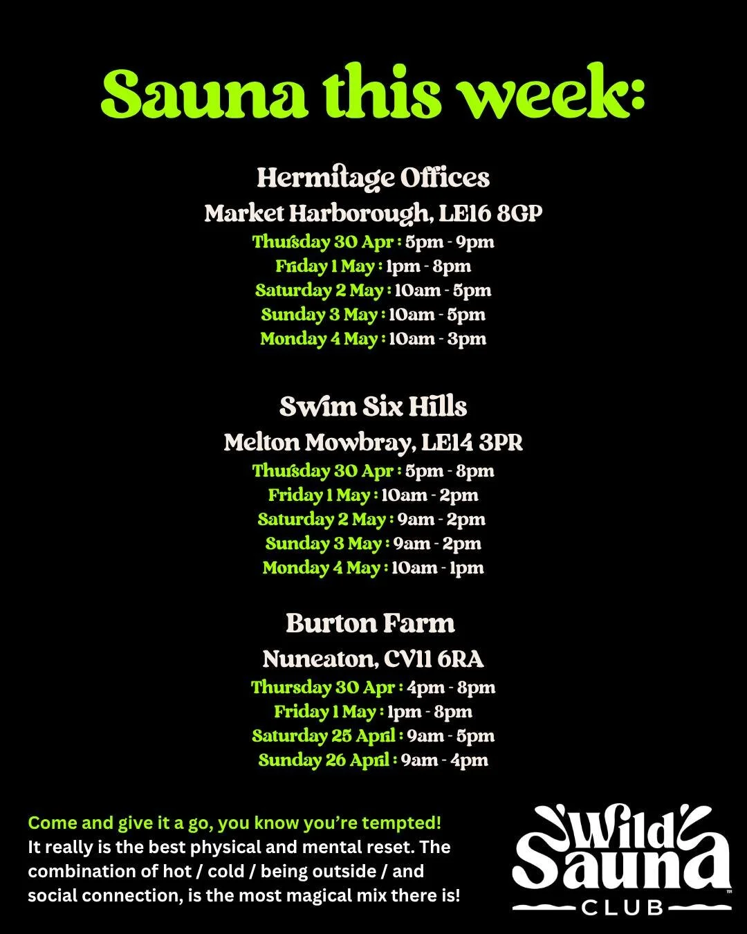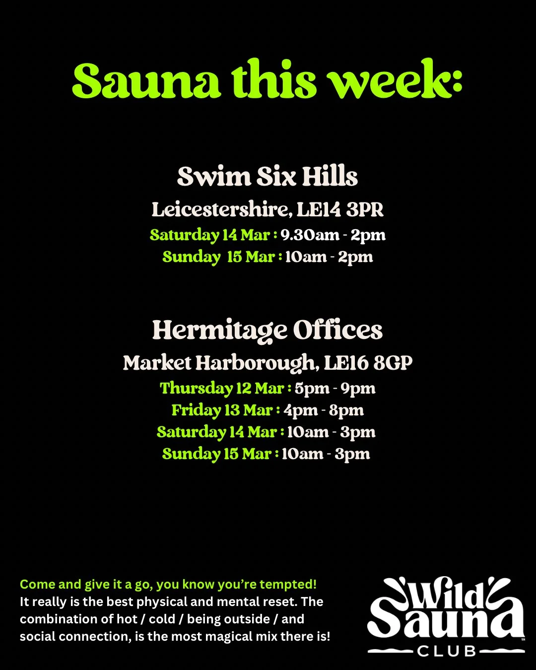 Discover the magic of healing through heat and steam. Book a session at one of our regular venues across Leicestershire and Northamptonshire, or at one of our pop-up wild spas combining heat and cold plunge.